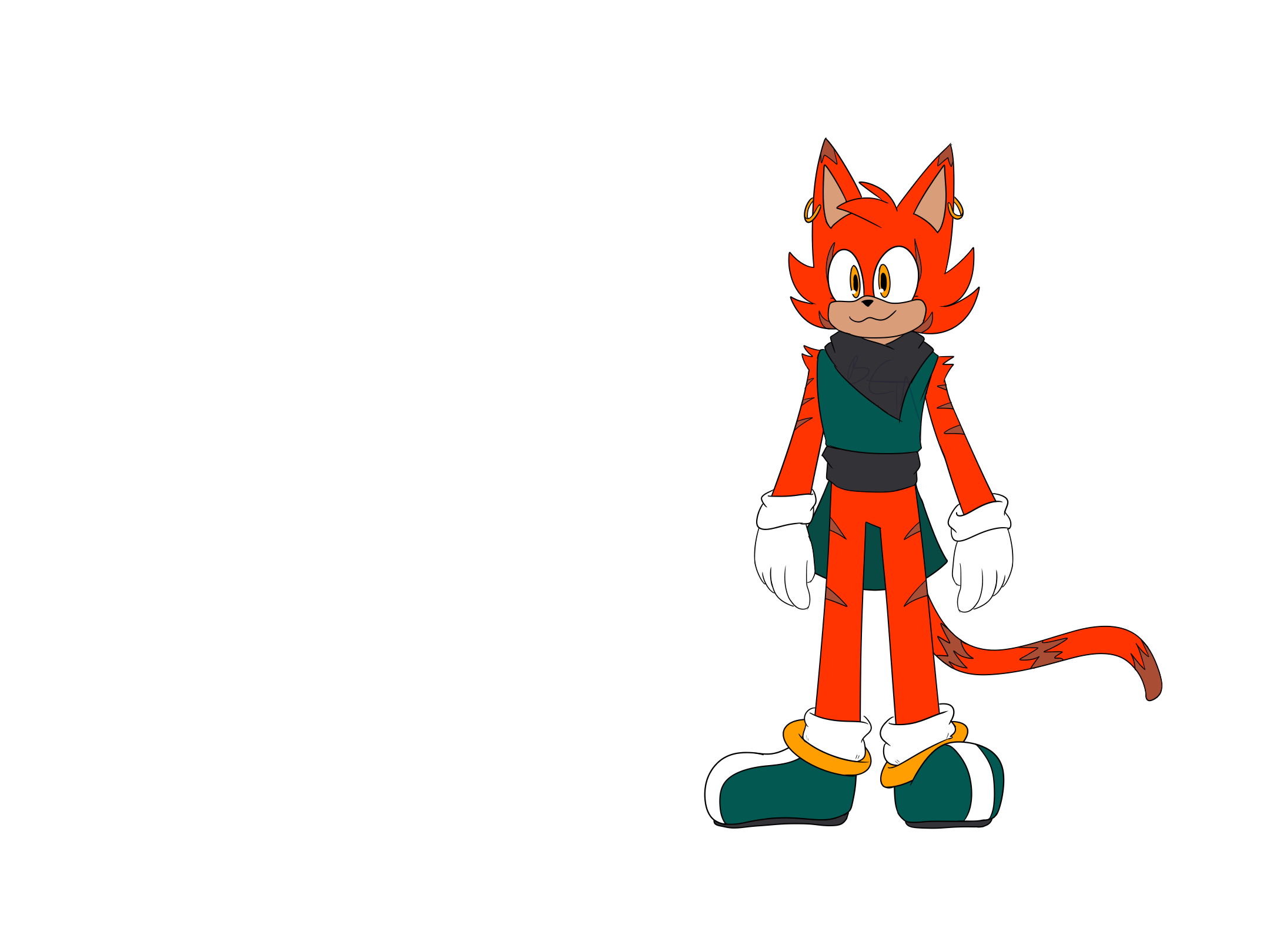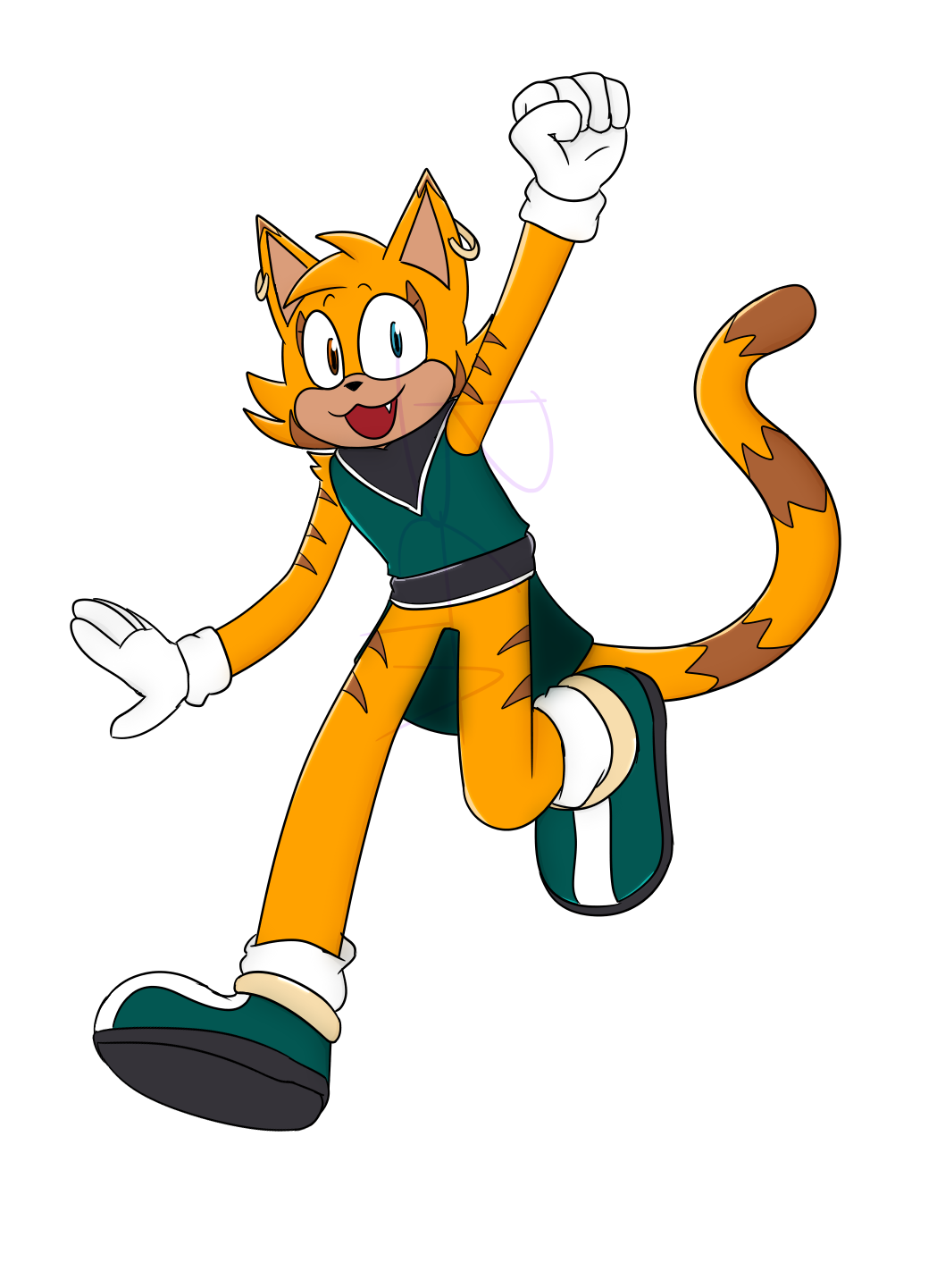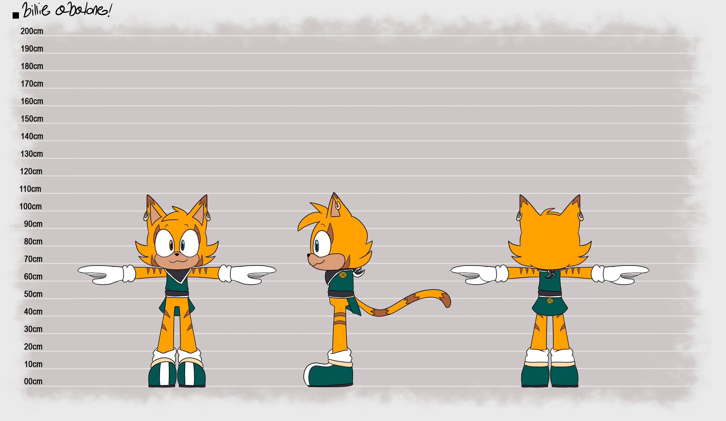 Billie has heterochromia; having one amber eye and one blue eye, and golden fur with brown stripes. His muzzle and inner ears are tan. Billie wears a dark teal tailcoat tanktop with a thick charcoal belt, and a charcoal bandana around their neck. They wear short dark teal boots with big white socks. His belt, bandana and boots all have a single white stipe. He has small, light gold hoop earrings and thick ankle bracelets that he wears over his socks. They wear very simple white gloves.